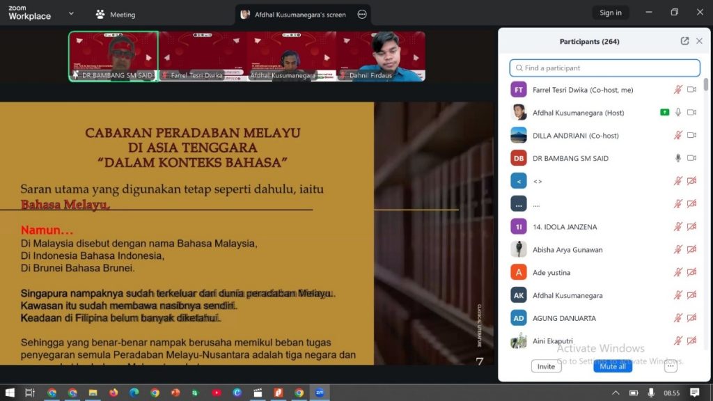 Membawakan materi berjudul “Peradaban Melayu dalam Konteks Bahasa di Malaysia”. Dalam pemaparannya, beliau menjelaskan keterkaitan erat antara bahasa Melayu dan bahasa Indonesia, serta sejarah panjang yang mengiringi lahirnya bahasa Indonesia. Bahasa, menurutnya, adalah warisan sejarah yang menyatukan bangsa serumpun sekaligus menjadi sarana memperkuat hubungan antarnegara di kawasan Asia Tenggara.